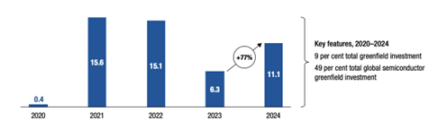 Chart 3: ASEAN – Announced greenfield investment in semiconductor sector, 2020–2024 (Billions of dollars)