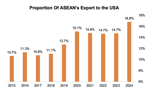 Over the past decade, ASEAN’s exports to the US have risen from roughly 10% to nearly 17% of the bloc’s total exports, underscoring its growing integration into high-value global supply chains.
