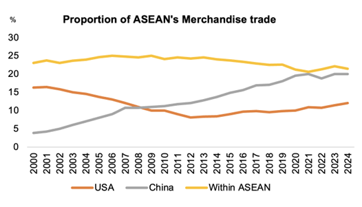 Intra-ASEAN trade has remained above 20% of total trade since 2000, underscoring the bloc’s interdependence.