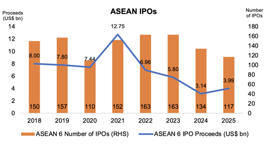 Capital markets are beginning to mirror this trade and investment resurgence. After three years of decline, ASEAN’s IPO pipeline strengthened in 2025, with US$2.5 billion raised in Q3 alone.